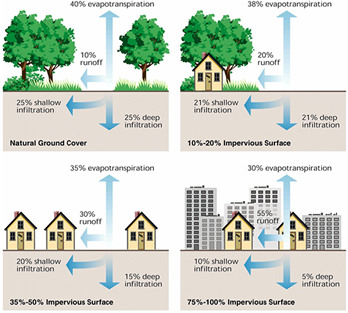 When development occurs, the resultant alterations to the land can lead to dramatic changes to the hydrology, or the way water is transported and stored. Impervious surfaces (asphalt, concrete, rooftops) and compacted earth associated with development create a barrier to the percolation of rainfall into the soil, increasing surface runoff and decreasing ground water infiltration (Figure 1).